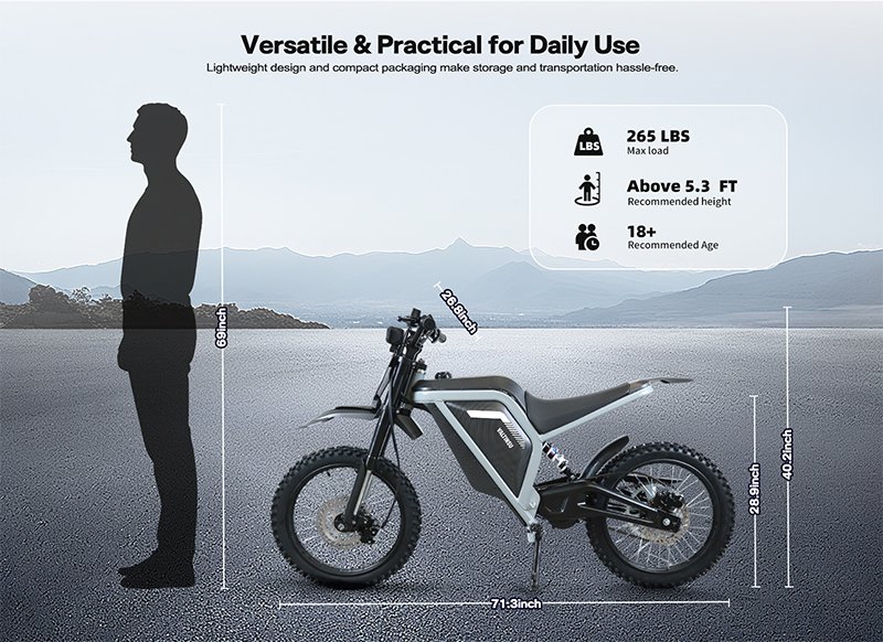 Tip:This electric dirt bike is designed for off-road or private land use only.